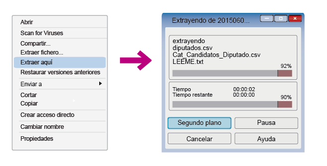 Extraer aquí para guardar en la misma carpeta o Extraer ficheros... si deseas guardar en otra ubicación.