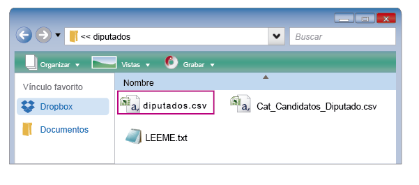 Haz doble clic sobre alguno de los tres archivos extraídos (diputados.csv, Cat_Candidatos_Diputado.csv, LEEME.txt).