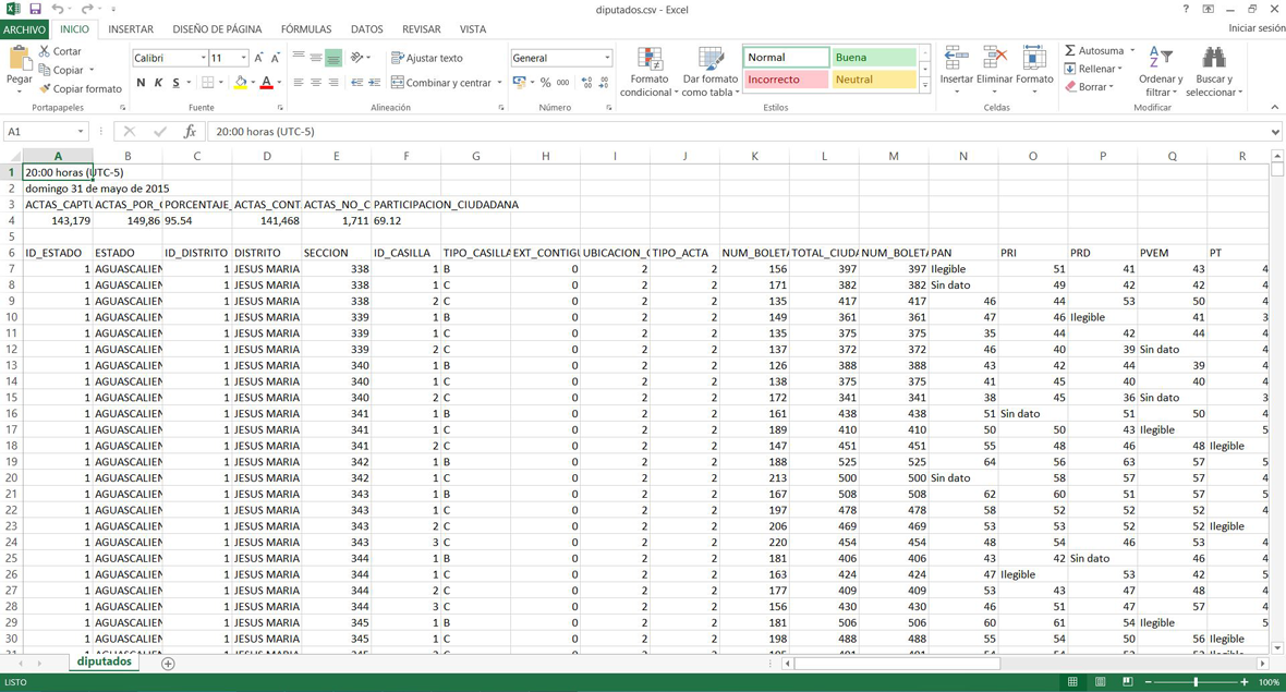 El archivo diputados.csv contiene los datos por entidad, distrito, sección y casilla de: